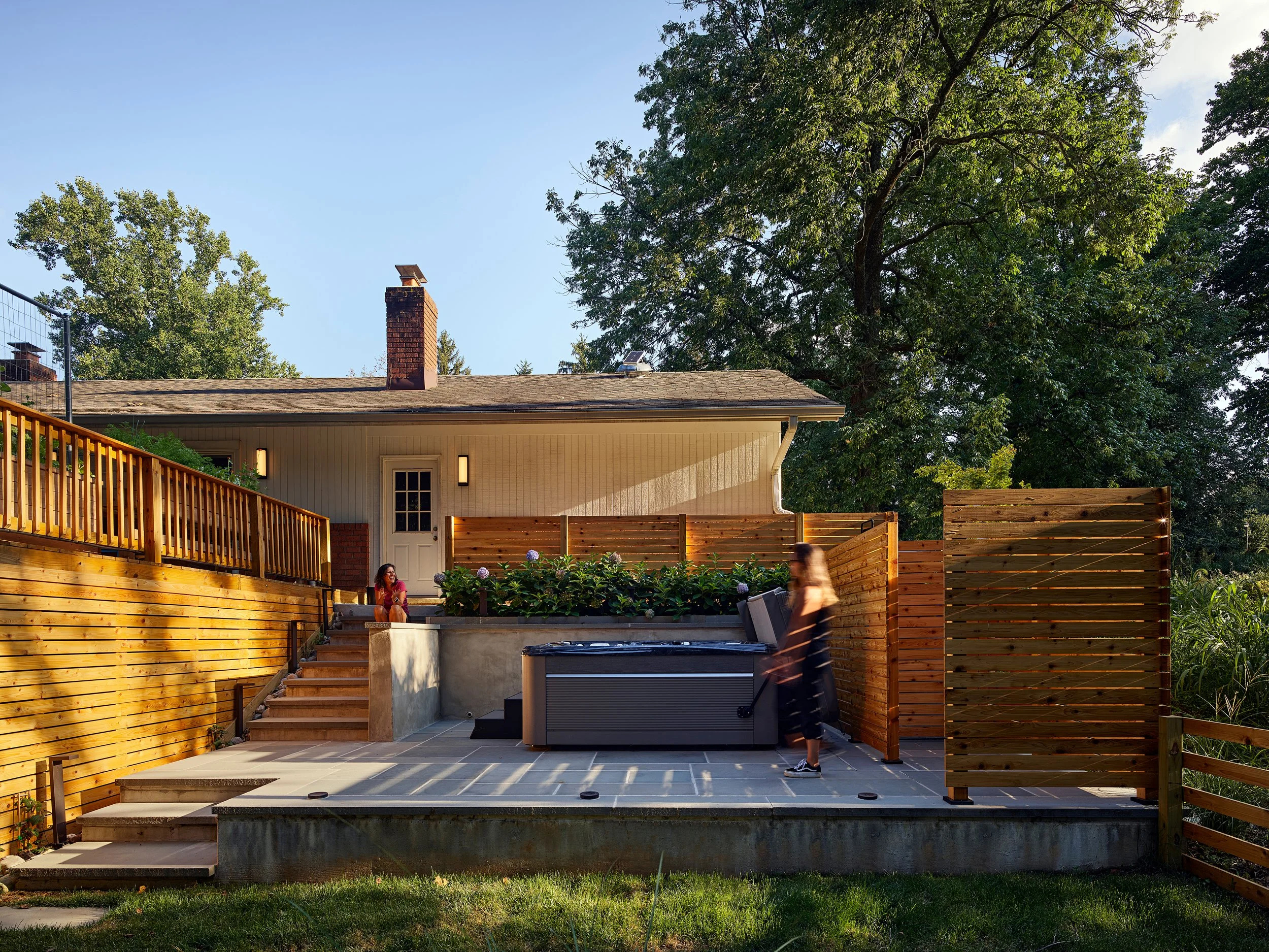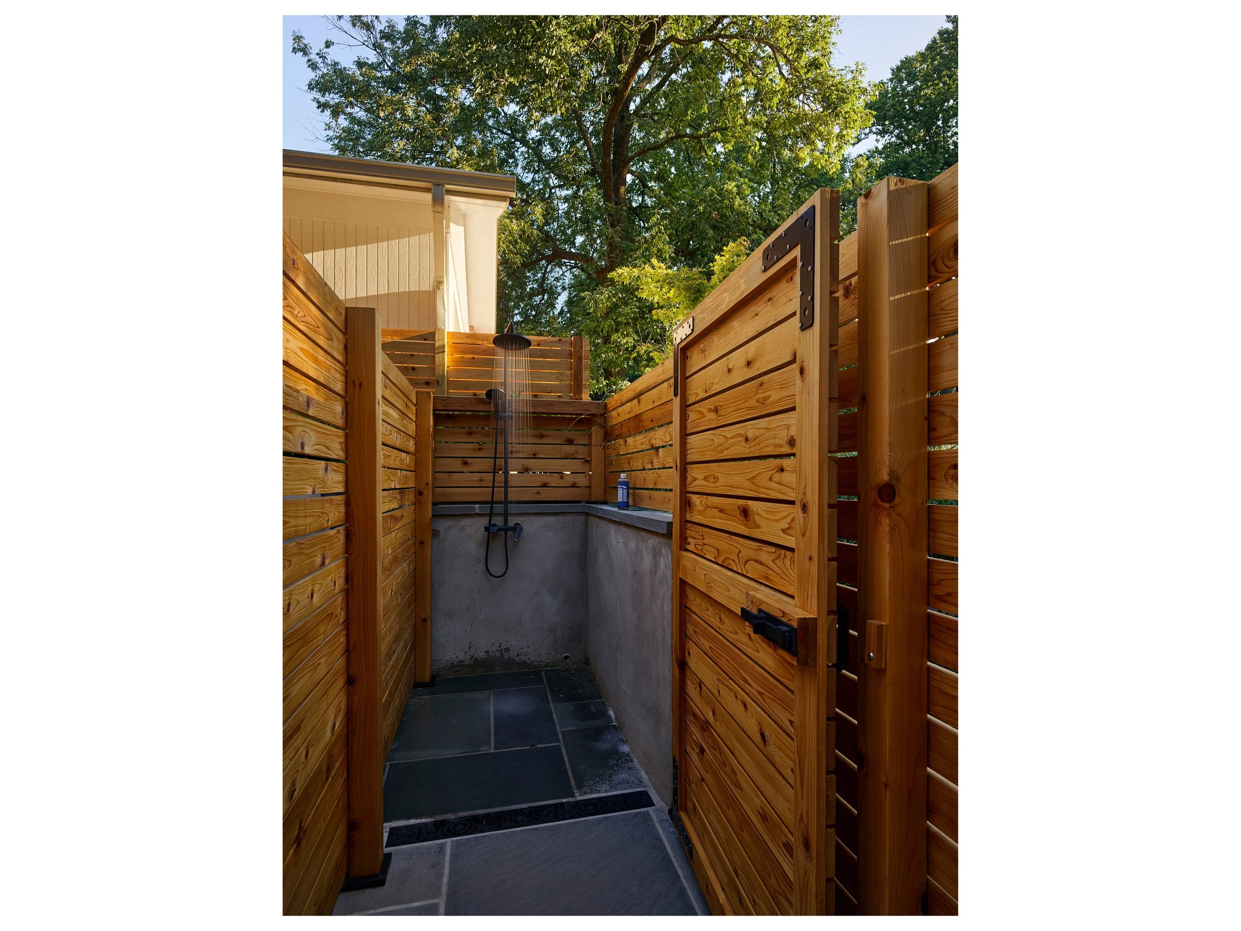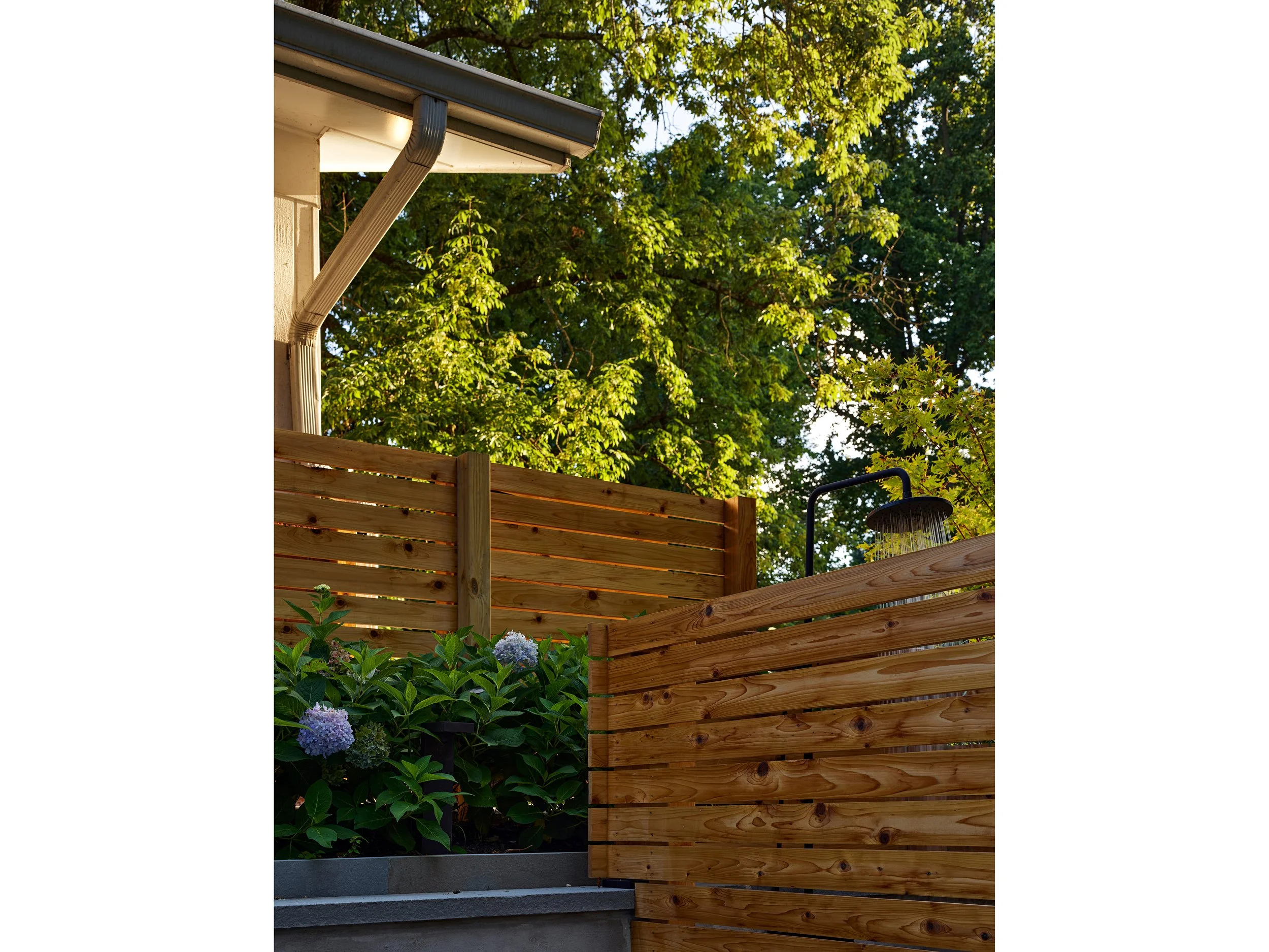 Concrete walls partially enclose the bluestone terrace, providing a sense of shelter while maintaining openness to light and air. Horizontal cedar slats define zones within the space, carving out areas for an outdoor shower and layered privacy screens while still allowing filtered views and ventilation. The material palette balances the cool permanence of concrete with the warmth, tactility of wood.
