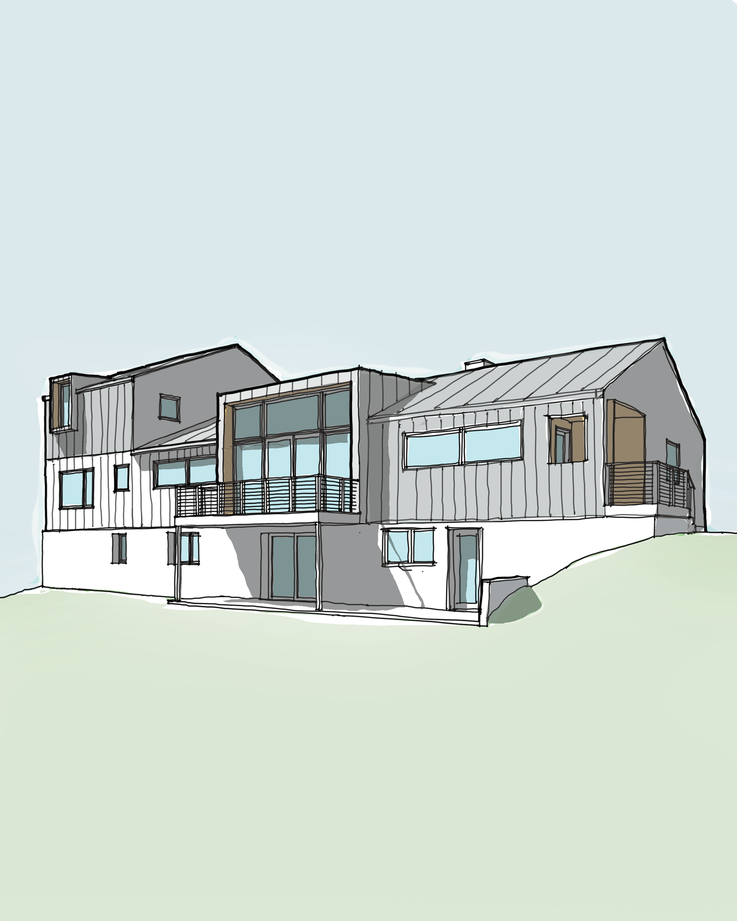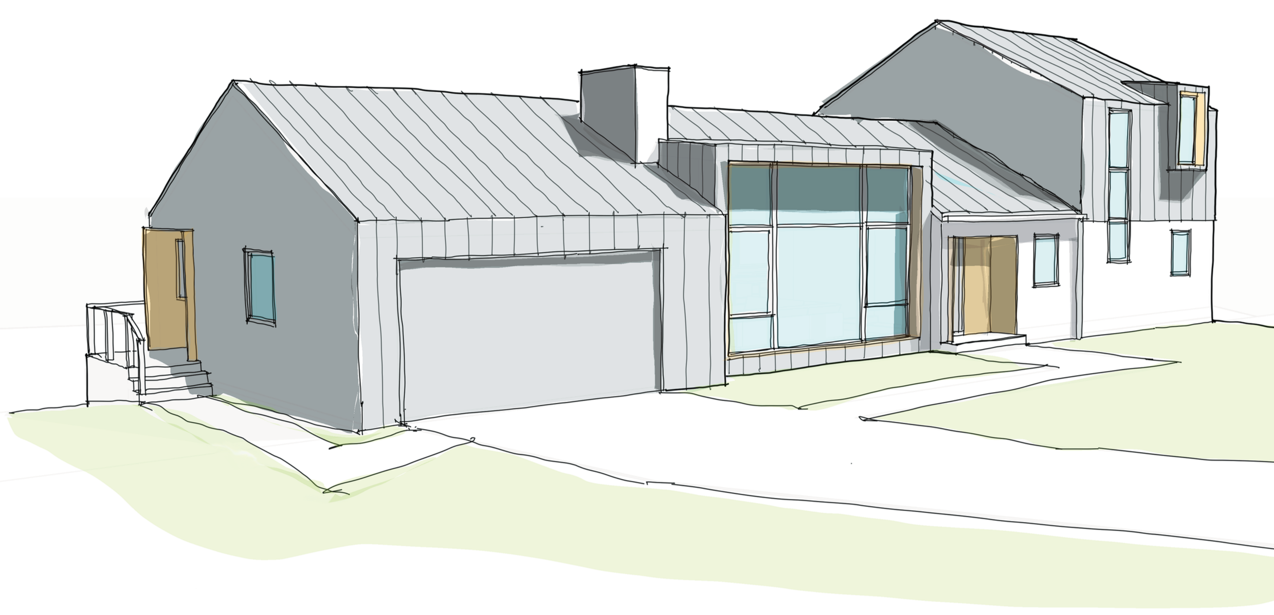 This project takes a modern approach to the traditional ranch. The reconfigured plan consolidates the living/dining space to the center of the home and extends the living space to the outdoors. The framed view dominates the elevation and establishes a hierarchy and tone for the project.