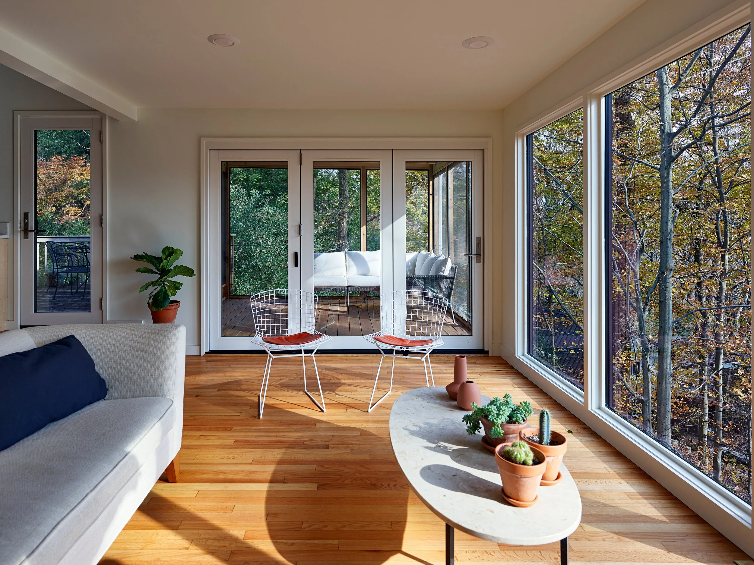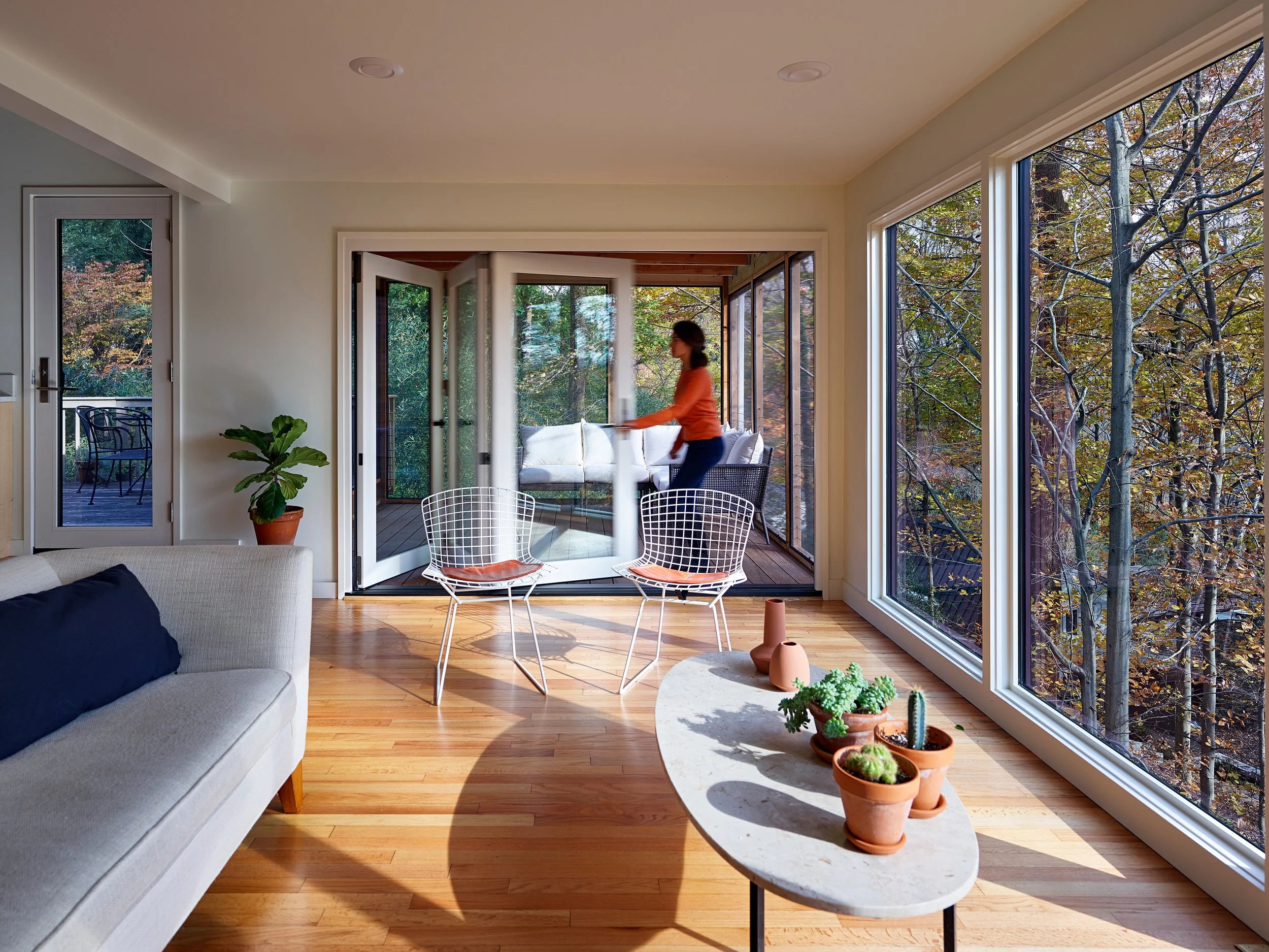 A screened porch was added adjacent to the interior sitting room, allowing the two spaces to function as one cohesive living area. A custom three-panel bi-fold door elegantly separates indoors from out; when opened on pleasant days, it invites generous natural light and cross-ventilation throughout the home.